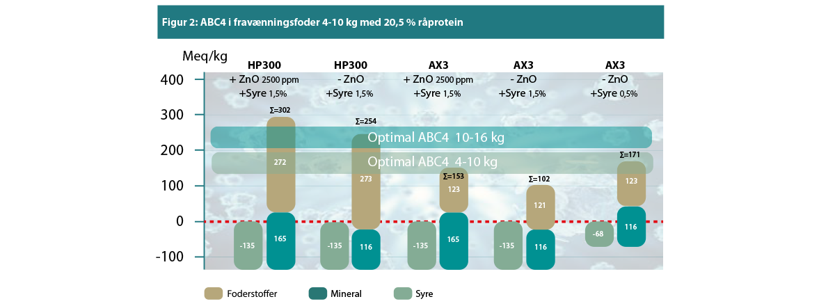 ABC4 værdien i foderet kan påvirkes direkte gennem valg af foder ingredienser. Dette er illustreret i Fig. 2, der er udarbejdet ved hjælp af www.animine.eu/abc4-calculator. Standardfoderet (4-10 kg) har 20,5 % råprotein, 2.500 mg ZnO og 1,5 % syre. Når ZnO fjernes, sænkes ABC4 en del, men ikke tilstrækkeligt til at nå det optimale niveau.