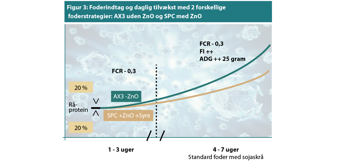 Den skitserede foderstrategi til erstatning for zink, men stadig med et højt niveau af råprotein, kan gennemføres ved at anvende AX3 som proteinkilde indtil 12-16 kg. Forsøg har vist, at den største effekt på foderoptag og tilvækst ikke ses i den vækstperiode, hvor smågrisene får tildelt AX3. Den store forskel bliver synlig i sidste fase, hvor grisen har opbygget et bedre vækstpotentiale og evne til at fordøje store mængder af almindelige protein-kilder, se Fig. 3.