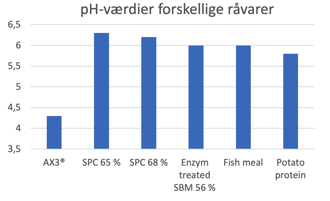 Den lave PH i varen understøtter den lave syrebindingskapacitet også kaldet ABC4. Andre proteiner ligger omkring PH6, hvilket ikke er optimalt ift. foderudnyttelsen og nedbrydningen af specielt protein. AX3® har en PH værdi helt nede på 4,25.