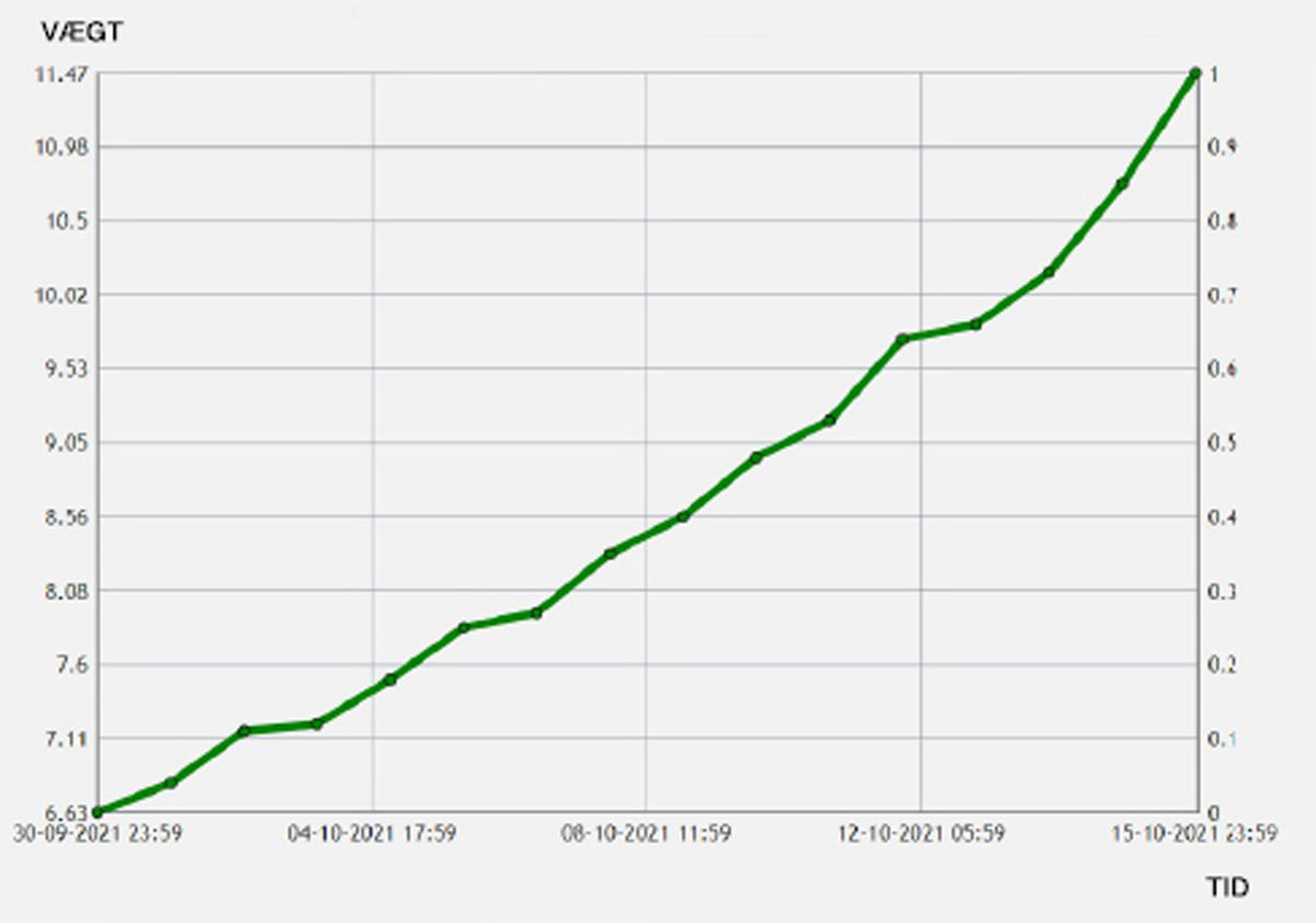 Herunder vises en vækstgraf på grisenes daglige tilvækst de første 16 dage efter fravænning. Med et resultat på 303 g. daglig tilvækst, i den kritiske periode efter fravænning. ![]() |